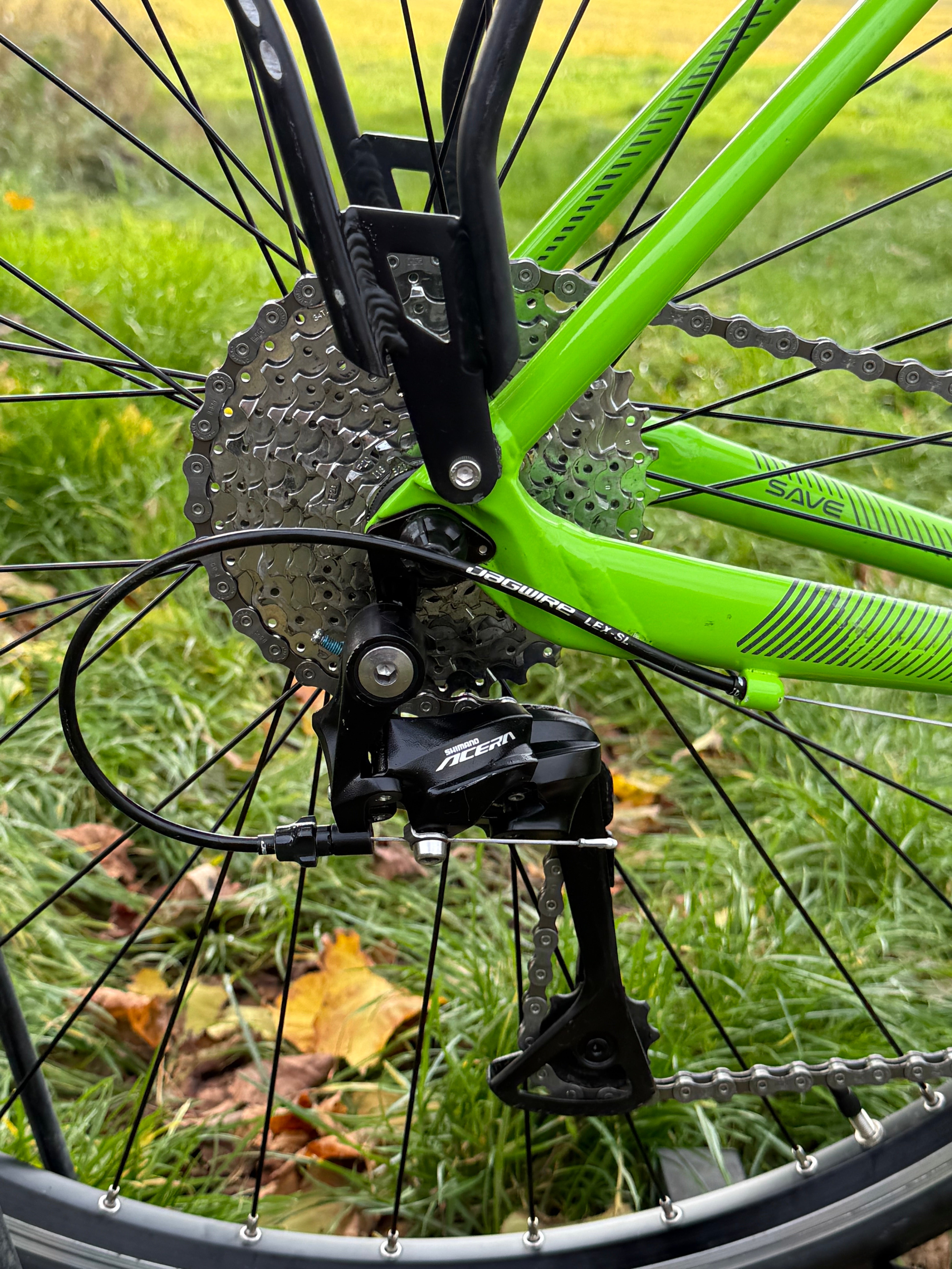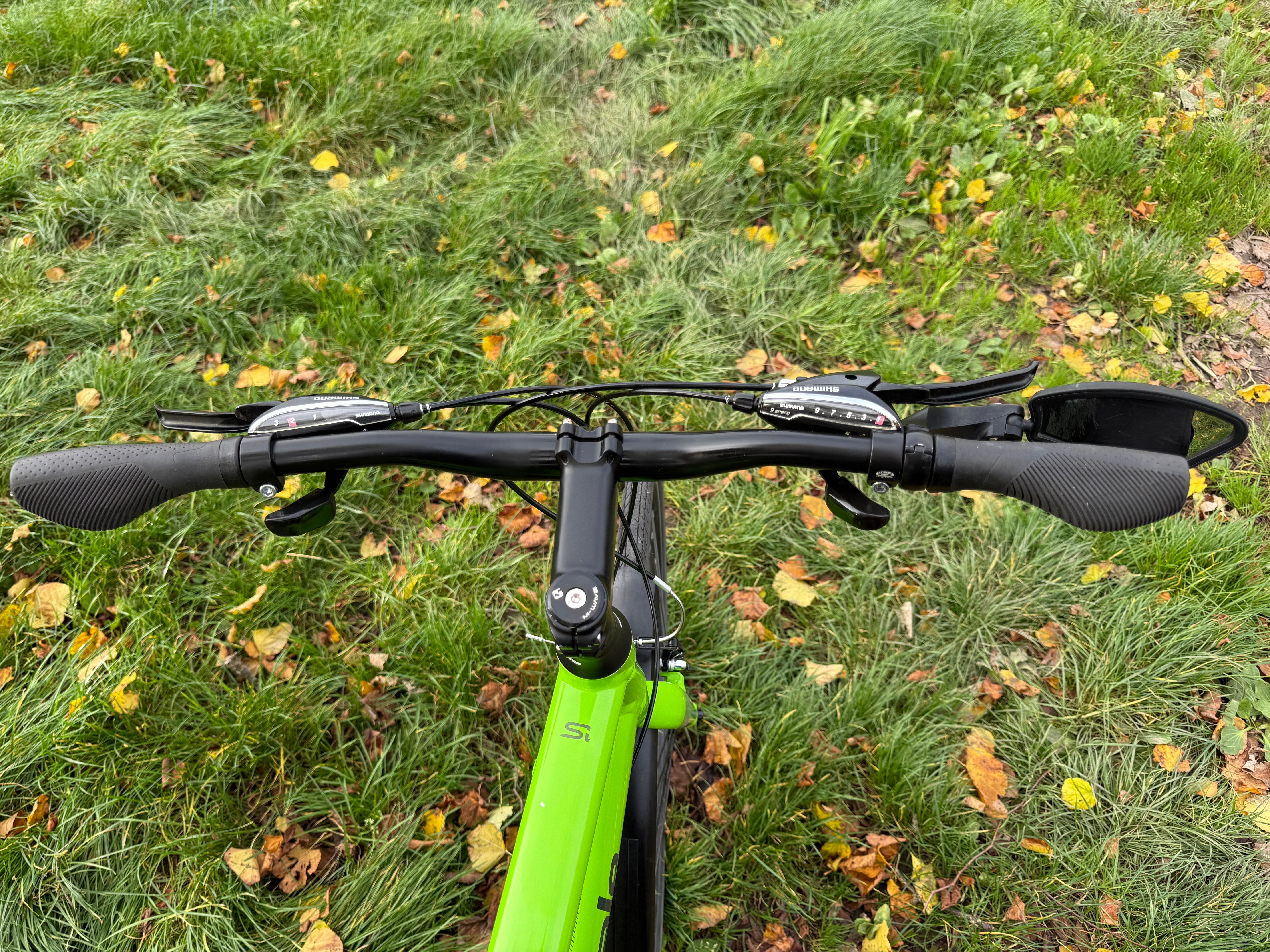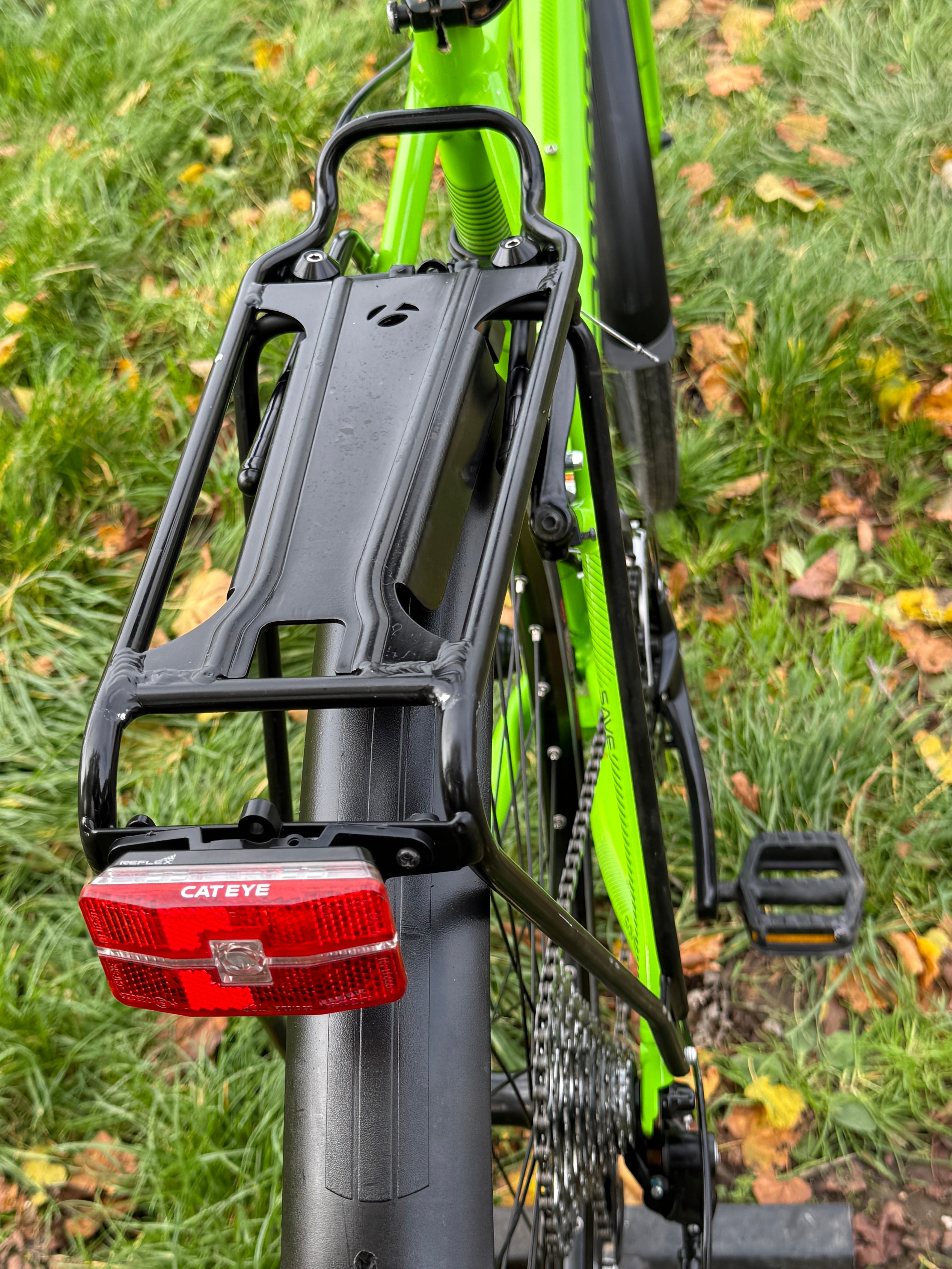 Equipped with Shimano brakes, Shimano gears (3x9 ratio), Mudguards front and rear, 700c Wheels, 700c x 32 Slick Tyres, Rear rack with a built in light and rear view mirror.